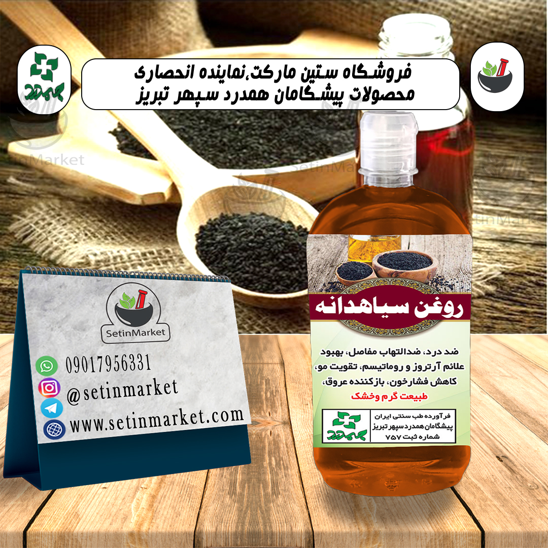 روغن سیاهدانه شرکت پیشگام همدرد تبریز روغنی ۱۰۰ درصد طبیعی است که با توجه به تازه بودن محصول و خالص بودن این روغن کارایی بسیار عالی در درمان بیماری های گوناگون دارد.